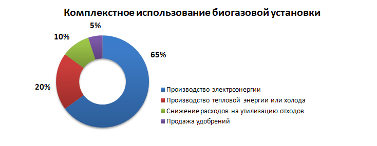 Переработка биомассы для получения биогаза не ограничивается лишь выработкой электроэнергии. Наибольшая эффективность биогазовой установки достигается путём комплексного использования всех видов продукции получаемых в результате работы станции. На диаграмме представлены статьи выручки при комплексном использования биогазовой установки.